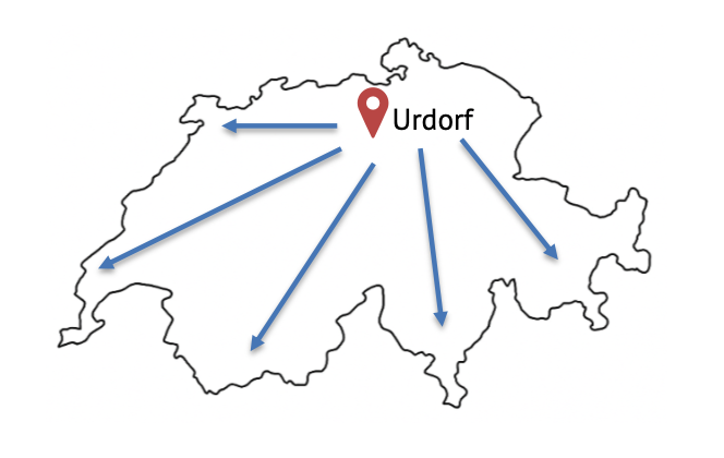 Schweizerkarte zeigen mit Ausgangspunkt Urdorf und Aktionspfeilen in die ganze Schweiz.